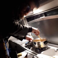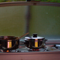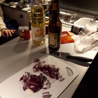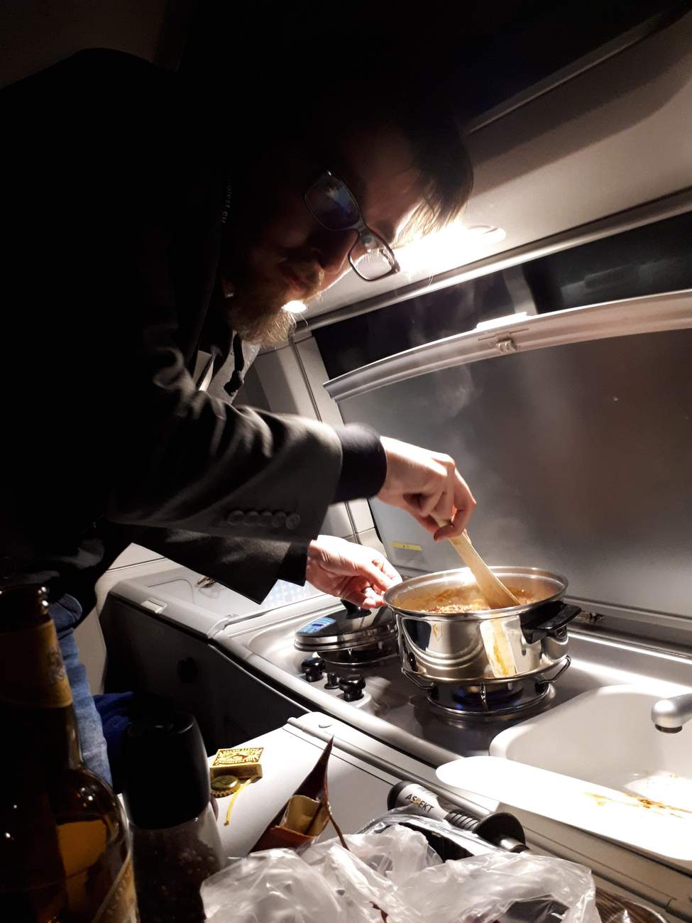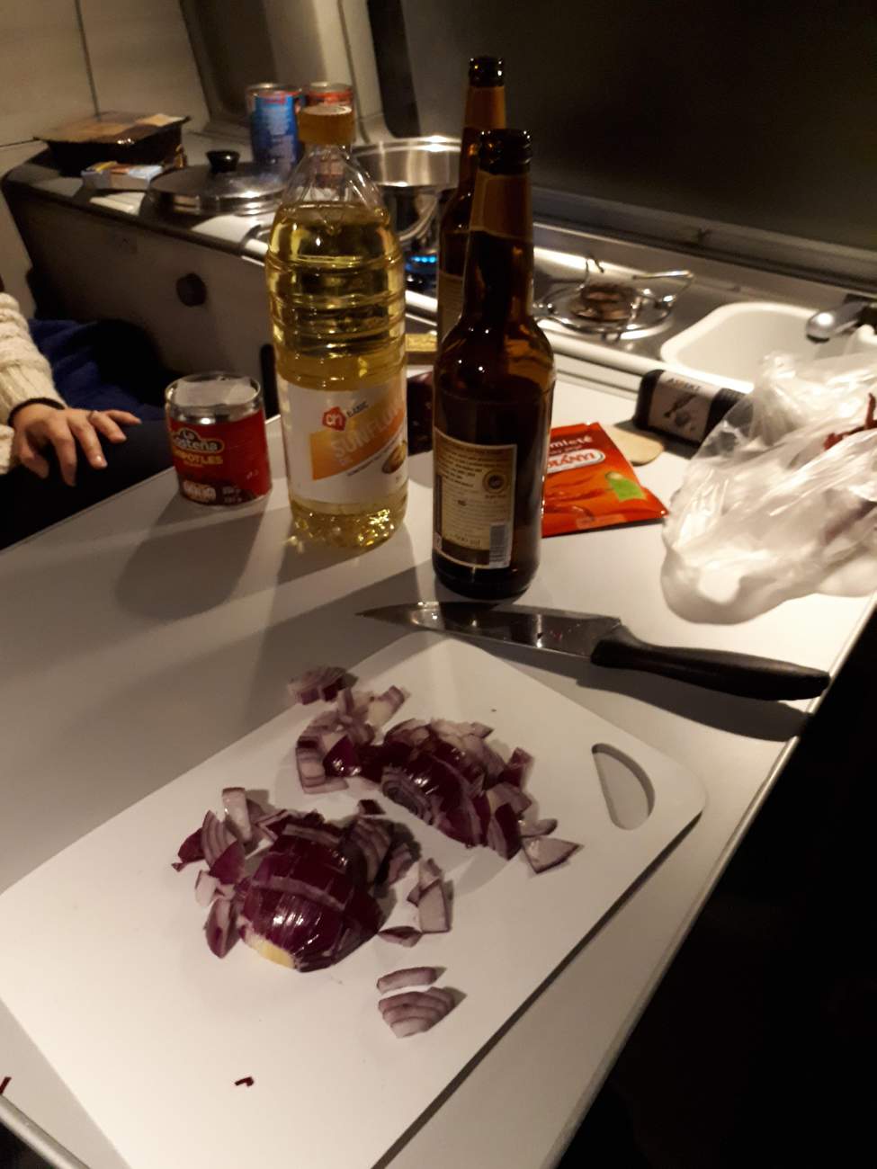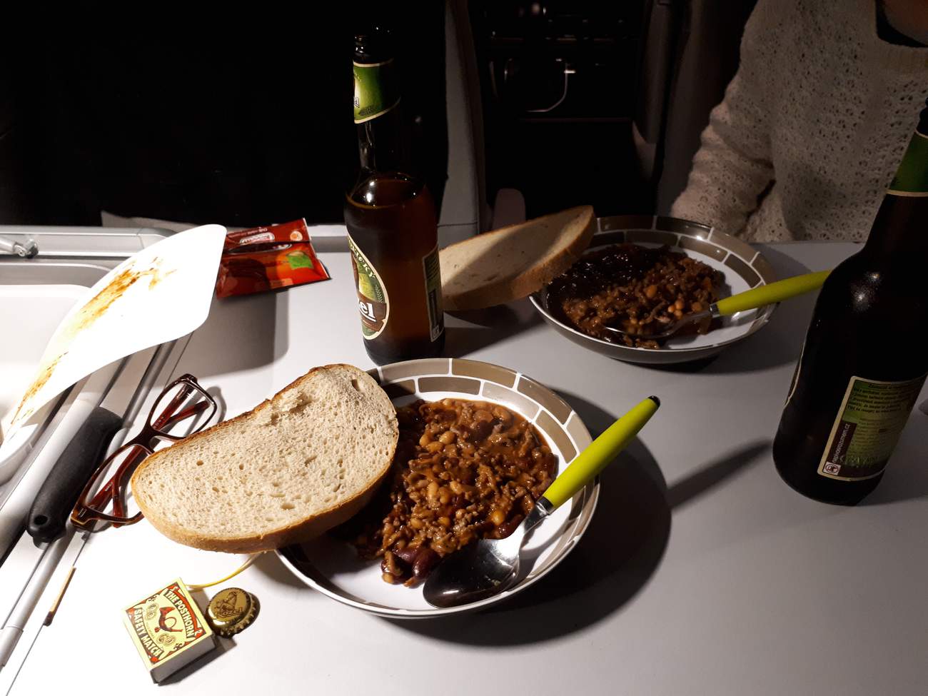 Máme tu sporák, něco co vypadá jako kuchyňská linka, lednici s jídlem, dřez – kde by mohl být problém? Jak se brzy ukazuje, pár věcí, kterým se musíte přizpůsobit, tu přeci jen je. Třeba v normální kuchyni jste patrně zvyklí, že se jídlo připravuje na pracovní ploše kuchyňské linky. Tady je pod ní lednice a vedle ní lavice. Krájet tu třeba cibuli by bylo poněkud nepohodlné. Naštěstí ale máme rozkládací stolek a tak cibuli i papričky chipotles krájíme pohodlně v sedě. Potom se stačí natáhnout vedle sebe, nalít do pánve olej, přihodit cibuli, po chvíli kajenský pepř a papričky a za další čas přidat i mleté maso. Teď je čas chvíli míchat – což je pohodlné, pokud zrovna sedíte na zadní lavici a máte hrnec hned vedle sebe. Pokud jste na druhé straně, může být míchání trochu nepohodlné, ale i to se dá zvládnout. Než maso zhnědne, uklízíme stolek, přihazujeme do hrnce fazole a ještě chvíli mícháme. Potom stačí přikrojit chleba a rovnou z hrnce naservírovat chili do talířů (které jsou samozřejmě součástí výbavy). Někdy je fakt, že plotna je sotva deset centimetrů od jídelního stolu, vlastně docela výhodný.