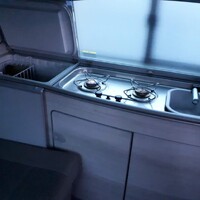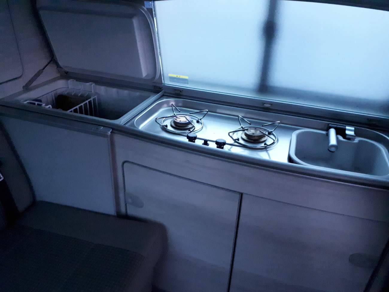 Druhým nejnápadnějším prvkem je kuchyňská linka uvnitř vozu. Ne, vážně – normální kuchyňská linka. Jen trochu zmenšená. Namísto druhé řady sedadel je jediná posuvná dvousedačka (o té ještě budeme mluvit později), vedle které jsou dvouplotýnkový sporák a dřez zakryté šikovným krytem, a lednička, jejíž víko dubluje roli kuchyňské desky. Pod tím vším je polička na příbory, vedle něco jako kredenc (jen narozdíl od toho ve vaší kuchyni obsahuje sejf). Celé je to někde na půl cesty mezi domečkem pro panenky či hrací sadou “malá hospodyňka” a opravdovou kuchyní. Prý je to dobré leda tak na uvaření kafe. No, na to se ještě později podíváme.