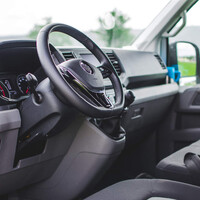 V Crafteru si však sednete jako v normálním autě – pohodlně opření celými zády a s volantem tam, kde ho chcete mít. Přímo před vámi, dostatečně vysoko a dostatečně svisle. Navíc jeho rozměry nepřipomínají věnec pro vítěze dostihů. Vlastně je to úplně stejný volant, jaký najdete třeba v Golfu. V případě testovaného exempláře dokonce se sportovním zploštělým spodkem, který v obří dodávce vypadá vážně legračně (vyhřívané volanty se pravděpodobně dělají jen ve verzi s plochým spodkem). Vlastně si tak nějak všeobecně připadáte jako v Golfu…