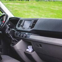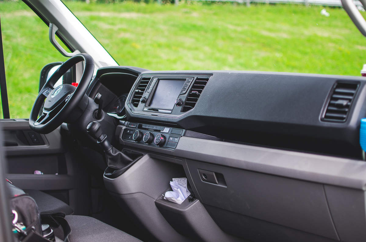 Ano, samozřejmě jsou tu rozdíly. Sedíte asi o metr výš. Všude kolem vás je nezvykle mnoho místa a posaz je vzpřímenější. I ty materiály jsou méně jemné a hebké na omak, spíše robustní a odolné. Všude kolem vás (i nad vámi) jsou spousty odkládacích přihrádek na věci nejrůznějších rozměrů – čímž jsou očividně míněny především věci, se kterými budete pracovat. Ale celkový dojem nezapře jistou “golfovitost”. Pokud jste zvyklí na osobní auta z Wolfsburgu, budete se tu cítit jako doma. Povědomé budíky, známá tlačítka i další ovládací prvky, rádio s dotykovým displejem, vše je úplně stejné jako v osobních autech. Všechno působí hrozně normálně a obyčejně. Což je vlastně nakonec úplně neobyčejné, protože vám to umožní téměř zapomenout na fakt, že je za vámi ještě nějakých pět metrů auta…