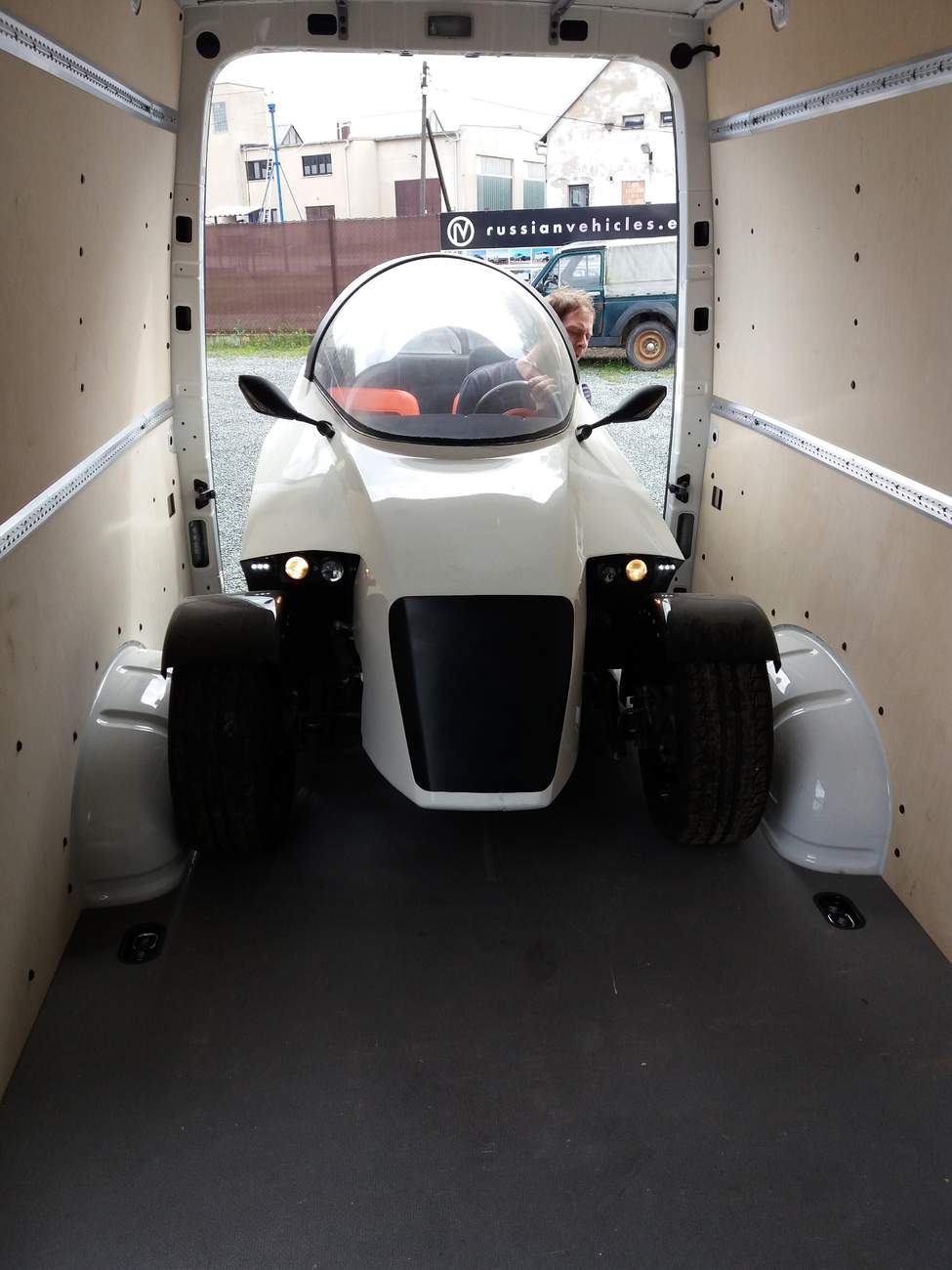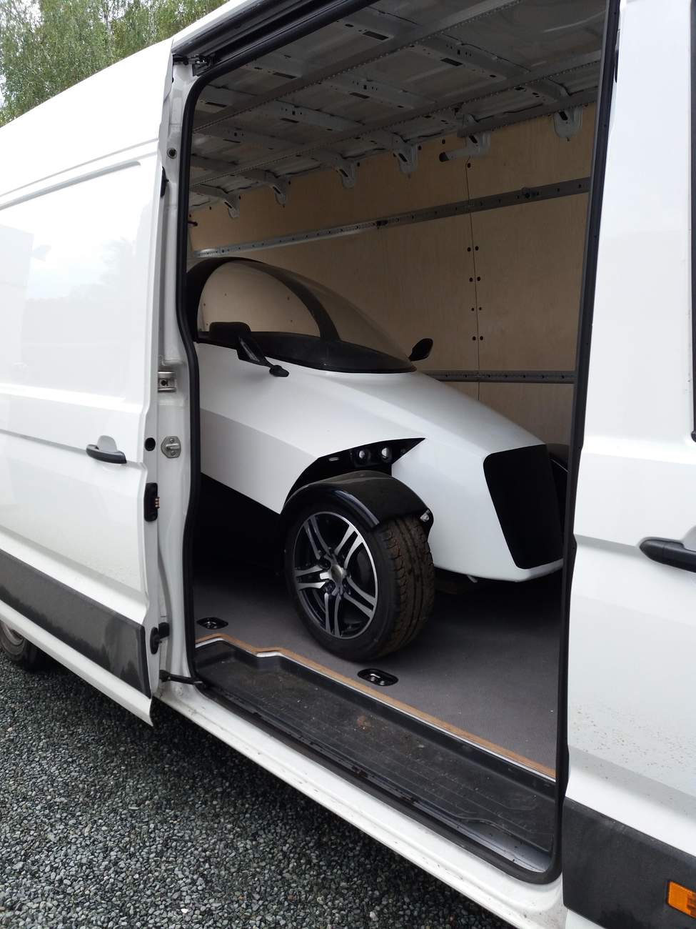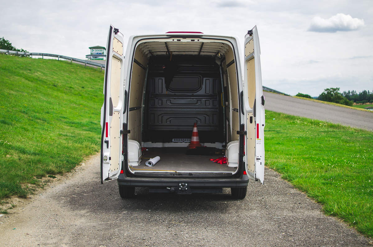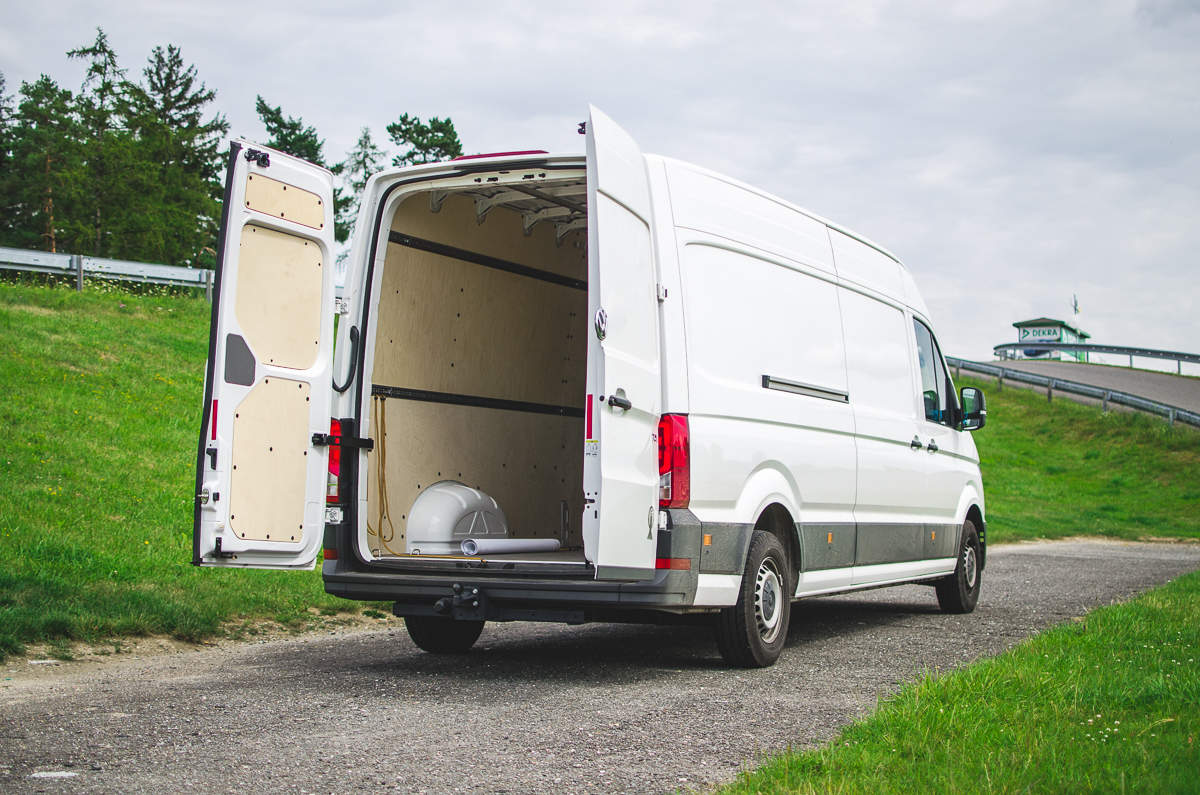 Naštěstí už jsme věděli, že šířka elektrostroje těsně umožňuje vecpat se do minulé generace Crafteru, což nám dávalo slušnou naději, že ho vměstnáme i my. A po chvíli laborování s nájezdovými prkénky a opatrném navigování se podařilo. Auto bylo v autě. Ještě přivázat k šikovným očkům rozmístěným v podlaze (při přepravě grilu na trackday jsme zase ocenili lišty s oky na bocích a na stropě – sice za příplatek, ale úžasně praktické), a můžeme vyrazit.