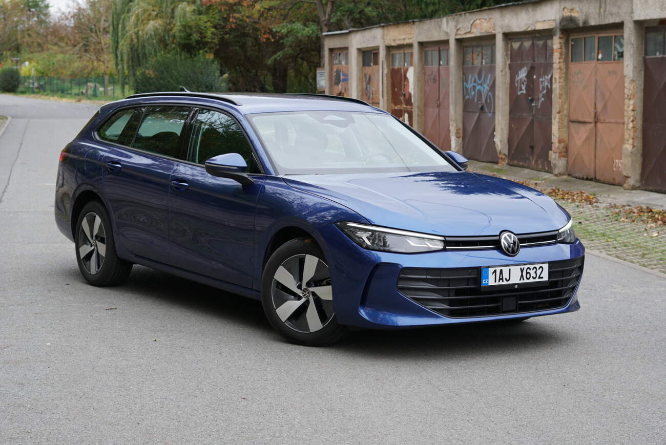 Hodnotit vzhled Passatu nebylo nikdy snadné. On totiž nikdy nechtěl být krásný ani výstřední. Passat je ztělesněním německého konzervatismu na čtyřech kolech, uhlazený, rozvážný a spořádaný. Nikdy jste od něj nemohli čekat designový šok, žádné dramatické linie ani světelnou show hodnou sci-fi filmu. Vždycky to byla sázka na jistotu a v nové generaci se na tom nic nemění. Přední maska působí mírně přívětivě, skoro jako by se auto chtělo omluvit, že existuje, ale přitom všechno zapadá přesně do současného designového jazyka Volkswagenu. Boční profil? Takřka totožný se Superbem, což vlastně nikoho nepřekvapí. A záď? Klasika, žádné experimenty, žádné falešné výfuky, jen poctivý kufr. Na testovaném kousku to celé doplňuje firemní odstín modré, který volá: „Jsem služební vůz, ale s elegancí.“ Když nad tím přemýšlím, vnější vzhled ve mně vlastně nevzbudil skoro žádné emoce. Zato interiér si zaslouží pochvalu. Němci ho zvládli lépe než kolegové z Mladé Boleslavi, působí čistěji, přehledněji a tak nějak víc „Volkswagen“. K úplné dokonalosti by to chtělo snad jen zapustit displej do dekoru palubky, který se táhne přes celou šířku interiéru. Jinak ale nemám výhrad. Materiály jsou poctivé, zpracování precizní a prostoru tu je víc než dost. Přesně takhle má vypadat poctivý kombík střední třídy.