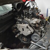 To ale samozřejmě ještě neznamená, že je všemu konec, protože přicházejí na řadu ty menší problémy – napínák řemenu je nějaký vychýlený z osy a lehce křivý. K jeho výměně za ten ze starého motoru je ale potřeba zas ten konečně přišroubovaný motor odšroubovat a tentokrát o něco málo spustit níž. Když už je motor v pohybu, je dobré přidělat i kompresor klimatizace, protože k jeho šroubům se dá taky dostat jen tehdy, pokud máte na ruce minimálně dva ohyby navíc. Díry na šrouby ve výfukových svodech jsou tak úzké, že jimi prakticky neprojde jakýkoli standardní ořech z gola sady.