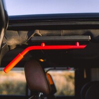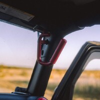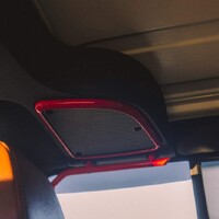 Na závěr se ještě na chvíli zastavíme v interiéru. I tady došlo k několika jednoduše realizovatelným úpravám. V souladu s barevným laděním vnějšku se sem nastěhovaly červené doplňky a skutečně robustní “oh shit handles” pro přední i zadní řadu sedadel – opět jen jednoduše přišroubované do již existujících předpřipravených děr. Ačkoli jde o už poměrně starší kousek, výbava je stále soudobá, chyběl mi tu asi jen protokol CarPlay/Android Auto, ale jinak je tu vše nutné k pohodlnému cestování. Překvapilo mě, jak je vůz, i přes svoji modularitu a sundavací střechu dobře odhlučněný a použitelný pro normální cestování. Dokonce i audio je tu vcelku kvalitní, ačkoli konstruktéři museli umístit reproduktory do různých netradičních míst v rámci skeletu, aby zůstala možnost sundávání dveří a panelů karoserie.