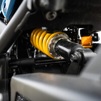 Celé nám to tu vyznívá pěkně pozitivně, takže je čas plynule přejít k těm nedostatkům. Vidlice a tlumič mají sice správnou zlatavou barvu, jenže postrádají ten správný nápis (Öhlins). Vpředu jde nastavit vše, vzadu pouze předpětí. Když se do toho podvozku začnete opírat trochu vyšším tempem, tak zrovna neoplývá sebevědomím. Každou trefenou díru mi dá pocítit. Pozoroval jsem, že vzadu za to do jisté míry může i ono tvrdé sedlo, které prostě neutlumí téměř nic. Podobně jsem to ale vnímal i přes řidítka, navzdory tomu, že motorka se při propružení na místě jevila celkem měkce. Zkoušel jsem si pohrát s nastavením a trochu obměkčit rebound, ale pořád se mi to nějak nezdálo. Asi by bylo potřeba se s tím více piplat, případně jezdit po lepších silnicích. Spoustu svých tradičních oblíbených úseků jsem musel vynechat, kvůli mokru. Jako by trochu nestíhal to tempo, které vám umožní ostatní komponenty.