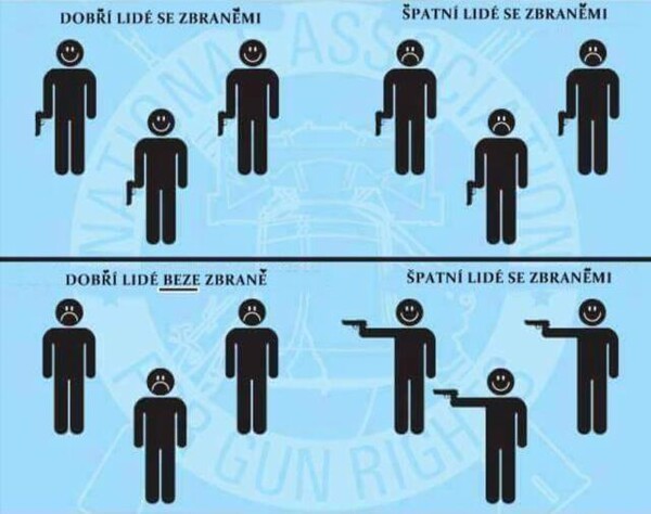 5. 11. 2019, 14:07Špatní lidé jsou snad jasní, ne? Všichni ti, co usilují o cizí majetek, zdraví či život. A úsměvný diagram? Neřeším nějakou organizaci, ale princip. Magor se zbraní chce v drtivé většině případů sebou vzít co nejvíc lidí a na to je nejlepší místo s neozbrojenými lidmi.