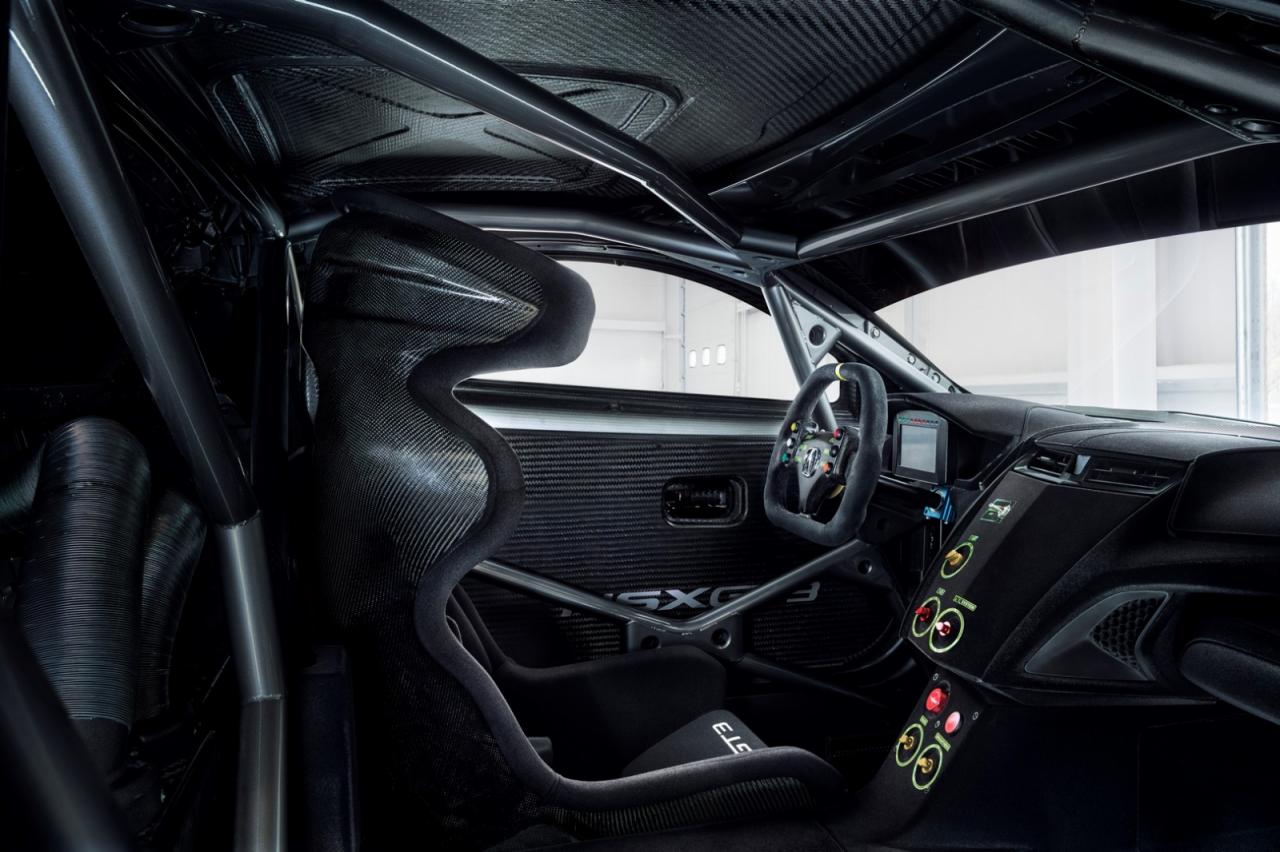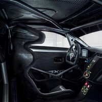 Uvnitř auta kůži a luxus neočekávejte. Místo toho dostanete jednu závodní skořepinu, bezpečnostní rám, jednoduchý semišový volant a pár páček a přepínačů. Standardní digitální palubku nahradila jiná digitální palubka, tentokrát závodní a jednobarevná. Víc koneckonců není potřeba.