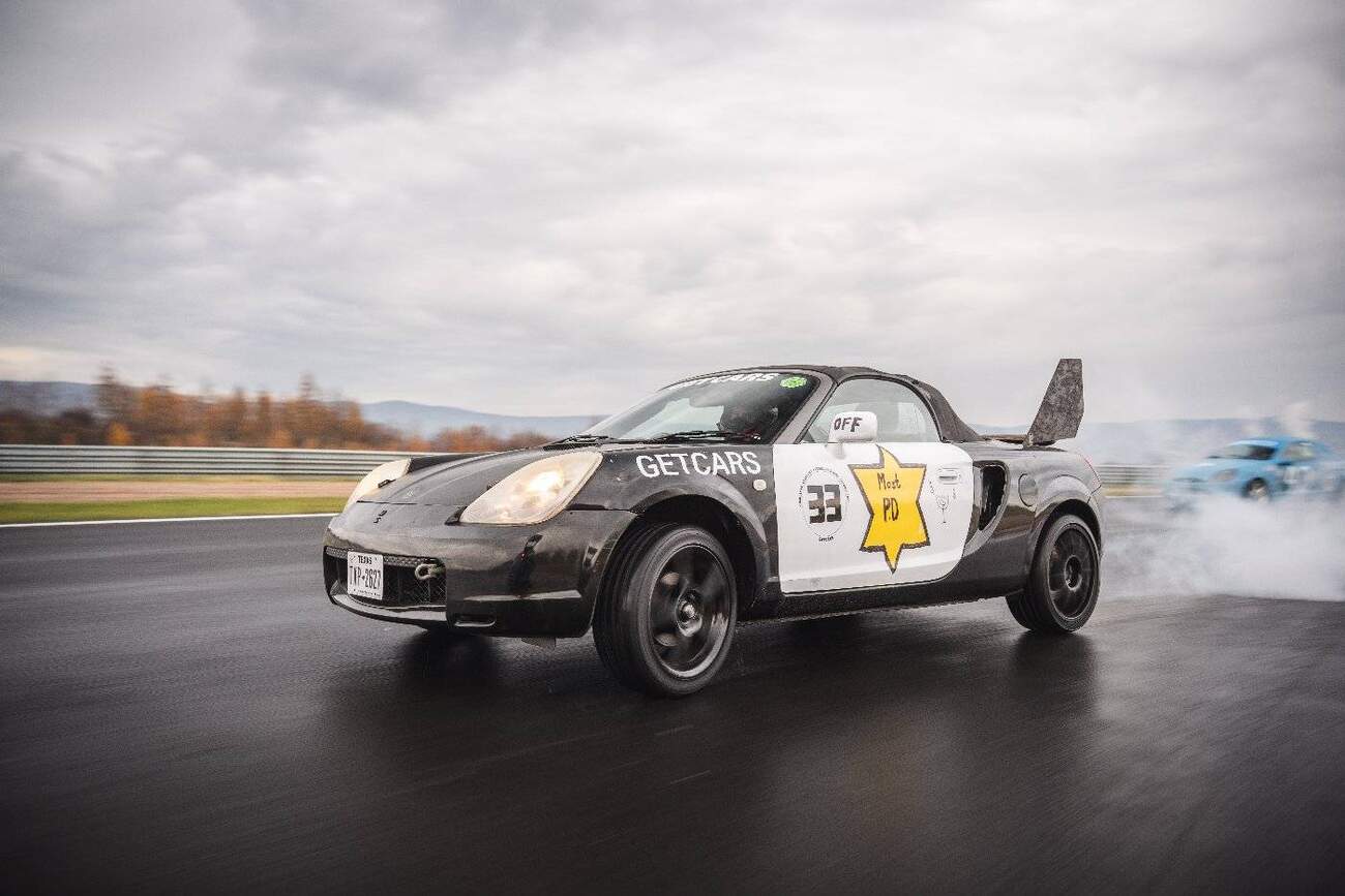 Předposlední příběh se nese ve znamení punku. Stroj byl opět stříbrný, opět zakoupený v aukci – a tak opět zcela neznámý. Věděli jsme jen to, že je tahle MR2 zrezlá natolik, že šla udělat sbíhavost přední nápravy, ale už ne zadní a že zadní sbíhavost rozhodně hezká není, tudíž bude auto vrtět zadkem víc, než je běžné. Destičky se zdály být v pořádku a kotouče vypadaly dobře. Závodního oleje jsme do motoru nalili ke spodní rysce, neb nám došly zásoby. Do auta se instalovala přídavná nádrž – po vzoru Audi z jednoho z předchozích závodů – a s tím se do kabiny nastěhoval i trvalý odér Naturalu 95 s bio složkou, která je samozřejmě ve všem úplně skvělá. Opět jsem startoval první. To už je zkrátka nepochopitelná kratochvíle osudu, že si vždy vyžeru mokrou trať a obvykle nejhorší chvilky začátků, ale už jsem na to zvyklý.