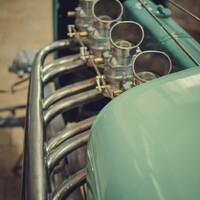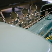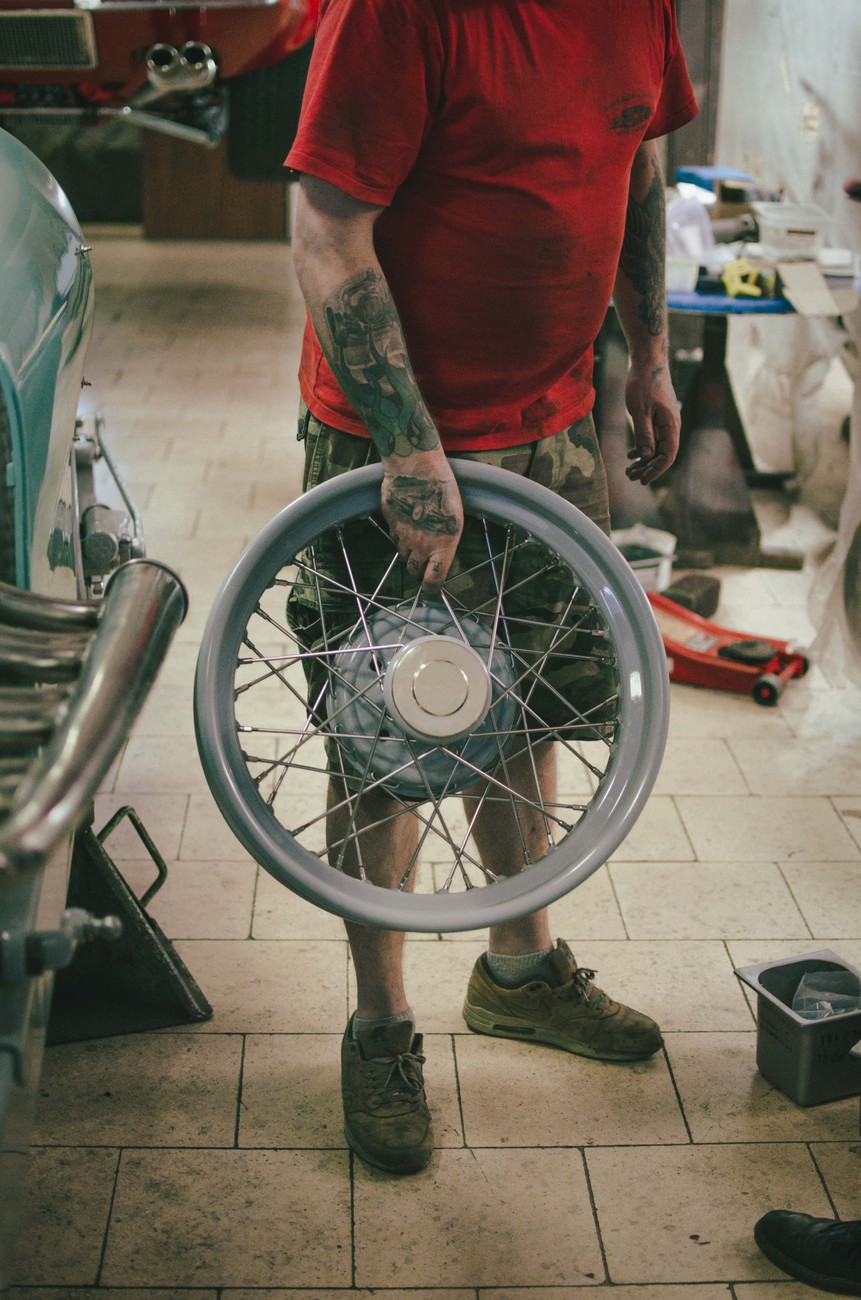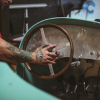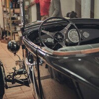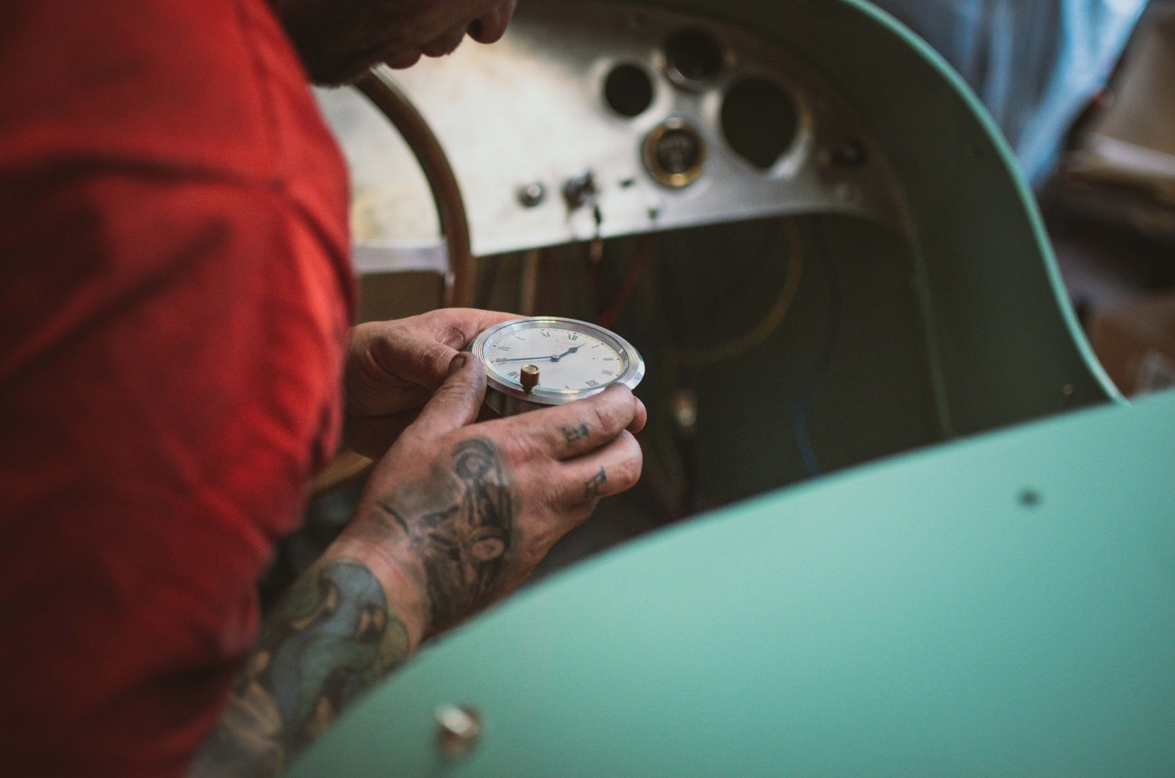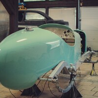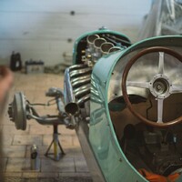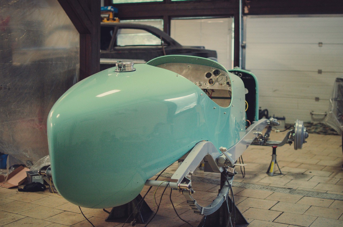 V téměř hotovém stavu už je to ale něco úplně jiného. Štíhlá, karoserie natřená pastelově zelenou barvou evokuje spíše Bugatti než hot rod, čtveřice karburátorů Stromberg a nablýskané výfuky naznačují, že se bude jezdit rychle, a detaily od ručně vyráběné masky přes krásně čalouněný interiér naznačují, že se tady nešetřilo časem, úsilím ani penězi.