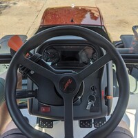 Teď je na čase nastartovat a vyrazit na cestu. Nastartovat, to není nic těžkého. Po tom mě ale čeká couvání z otevřené brány. Řadím zpátečku, pouštím spojku a … nic. Traktor si vesele stojí na místě jako by se nechumelilo. „Jó, to se nachytá každej, reverzace je na neutrálu, bez toho nikam nepojedem.“ Ruka mého průvodce sahá po oranžové páčce vlevo za volantem a traktor se sám od sebe rozjede dozadu. Aletaksakrapráce, tohle by se v autě nestalo. Po prvotním překvapení bez větších problémů vycouvávám a šup na cestu. Jedna, dva, tři. Jedu po zpevněné cestě rychlostí, při které by mě předběhl průměrný běžec. Násobič, o stupeň vejš, to ještě necháme chvilku bejt, jo? Potřebuju to trochu vstřebat. Seděl jsem za ovládacími prvky lecčeho, včetně pásy poháněných strojů, ale tohle je nějaké silné. Prvotní výklad o vychytávkách je pryč, naštěstí mám šanci se s nimi seznámit postupně sám. Na první nezpevněné cestě zastavujeme a je mi ukázáno kouzlo reverzace. Stačí mít zařazenou rychlost a můžete kvedlat s velkou oranžovou páčkou dopředu a dozadu. Na displeji na palubní desce se zobrazí, kam máte zařazeno a traktor se sám rozjede. A tam. A zpátky. Hehe.