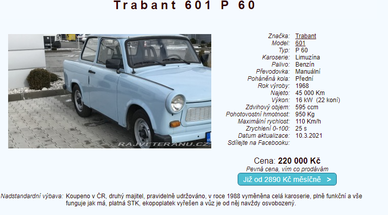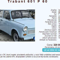 Na druhou stranu, v poměru cena:výkon si výše uvedená Tatrovka vede pravděpodobně vede stále lépe, než další úlovek. Trabant 601 nebyl dobré auto ani když byl úplně nový. Šlo spíše o jakýsi smutný ukazatel toho, kam dovedlo sovětské vedení tu méně šťastnou půlku Německa. Zatímco za železnou oponou si průměrný člověk v sedmdesátkách mohl zajít do dealerství a koupit si třeba povedený Opel Monza, nebo BMW 2002, východní němec tak maximálně zapsal své desetileté dítě do pořadníku na Tráboše a při troše štěstí se na něj po osmi letech dostalo. Opět chápu nostalgii, Trabant je zajímavým svědectvím doby, ale říci si za něj 220 tisíc, ještě se samolibým “vím co prodávám” mi přijde vrányhodné.