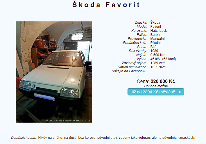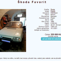 Investiční šílenství kolem Favoritů je v plném proudu, zblbnutí veteránisté mají oči na šťopkách a pátrají po vozech s asymetrickou maskou, přičemž senioři, jež tyto vozy dodnes sedlají jako své daily cary vesměs nechápou. Ale jejich podnikaví potomci se nebojí vzít příležitost za pačesy a vystavit jejich věrné daily na inzertní server za cenu klidně desetkrát vyšší, než by bylo vhodné. Sice se můžeme utěšovat tím, že autorovi inzerátu jen ujela ruka a chtěl tam napsat 22 tisíc, ale obávám se, že opak je pravdou, opravdu pravděpodobně doufá, že za vůz s orlojem místo otáčkoměru dostane bezmála čtvrtmilion. Perličkou, nad kterou se vždy rád usměji, je skutečnost, že si inzerent opravdu myslí, že mu někdo uvěří, že za třicet dva let své existence tento vůz nikdy neviděl déšť. Tak určitě.