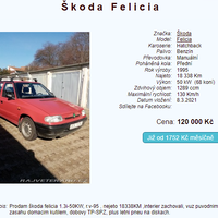 Dnešní druhý vůz s blinkry z Felicie. Zaoblený Favorit sice zatím nedosáhl věku nutného pro registraci na “véčka”, to ale spekulantům nebrání nabízet své městské interceptory za neuvěřitelné sumy. Pochopím to bez výhrad u FUNu, tak nějak akceptuji u speciálních edic, jako byla povedená Mystery, nebo Laurin&Klement. Ale základní červená ve výbavě “hodiny místo otáčkoměru” s tažným a zahrádkou za sto dvacet tisíc, kterou na focení nebyl majitel ani schopný umýt, si zaslouží jen výsměch.