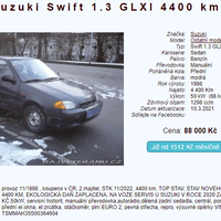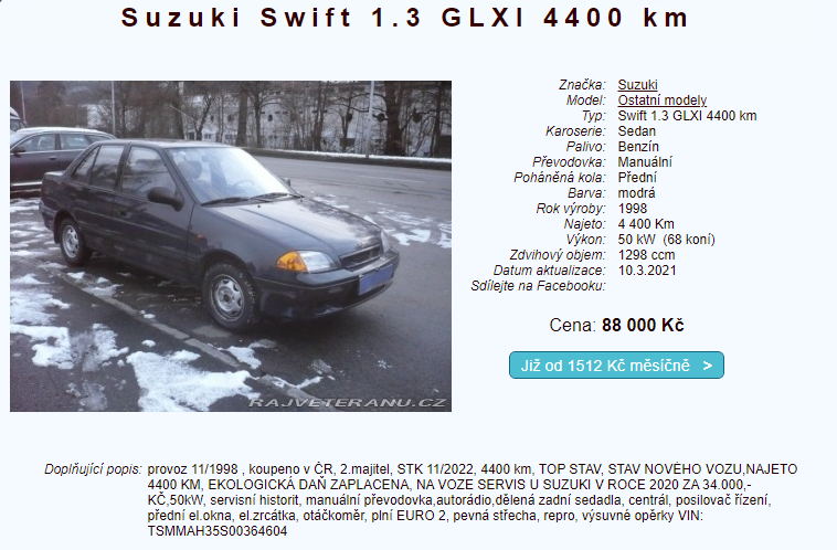 Nakonec nejsmutnější jsem z inzerátu na tenhle černý Swift sedan. Sám jsem měl podobné auto jako své první, mám ho docela rád. Není to žádný zázrak, ale funguje poměrně obstojně. Swift se vyznačuje mimo jiné tím, že má pětimístné počítadlo kilometrů. Takže nikdy nenajede víc, než 99 999 km. Tuto příležitost chytl za pačesy moudrý prodejce, který se rozhodl z nebohého suzuki udělat investiční káru. Ani nadměrné využití capslocku ale neschová fakt, že kobereček pod nohama řidiče a detaily interiéru žaují nájezd o minimálně sto tisíc vyšší. Závěrem je příhodné se zamyslet, proč by prakticky nejetý vůz potřeboval letos servis za 34.000,- Kč…