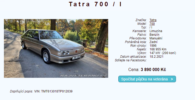 11. 3. 2021, 14:30k té Tatře - ono je to těžký posuzovat oprávněnost takové ceny. Pokud si dobře pamatuji, tak jich vyrobili kolem 60-70ks. Díly pro tahle auta prakticky nejsou, pokud nepochází z jiného. Koupit levný vrak = spousta zakázkové výroby a hlavně potřebujete mít druhou jako mustr. I proto je z tria 603/613/700 nejdražší. Na 603 se vyrábí dost věcí nových. Na T700 skoro nic. Takže pokud téhle nic nechybí, tak nevidím důvod, proč to za tu cenu nenabízet. Na prodej jsou jen dvě. Ta druhá bez uvedené ceny. Také je na místě se zeptat, kolik by tedy taková Tatra měla stát? Milion? Za to bude lepší Cadillac, Mercedes, pokud se tedy omezíme na koráby s V8.