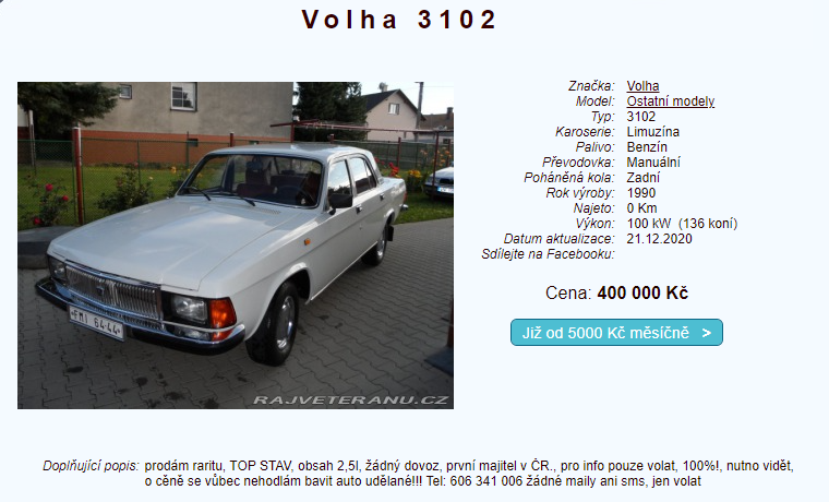 Ale může být hůř. Mnohem hůř. Vůz z inzerátu výše je sice zachovalý, ale přesto si myslím, že i obyčejný Favorit bude lepší auto. Produkty ruského automobilismu z let přelomu let osmdesátých a devadesátých jsou totiž přehlídkou zmaru, zoufalé zaostalosti a v plné nahotě ukazují, kterak může země velká svou rozlohou být malá svými výkony. Alespoň na poli samohybů. Tahle Volha je krám, není ani elegantní, jak to bývalo u jejích předchůdců, je to prostě jen hodně špatné auto ze špatné doby. Konzistentně s vozem samotným působí znění inzerátu, vykřičníky a “nehodlání se bavit o ceně” dotváří nehezký kolorit. Rychle pryč.