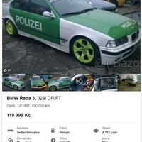 Naštěstí jsou tu i dostupnější bavoráky. Třeba tahle 328i ve speciální ghetto drift verzi. Nic proti tomu, s takovými auty je fakt sranda. Vykuchá se interiér, nacpou se tam polyuretany, short shift, trochu se poladí výfuk a další věci, nesmí chybět svárosvor, na estetiku to nejezdí a rez se foukne montanou. Mám takový styl úprav rád, sám jsem takto provozoval staré rozpadající se Mazdy a byla to zábava. Ale bývalo takovým nepsaným pravidlem, že se tahle auta spíš tak nějak dědila, než prodávala. A když, tak za ceny hluboko pod průměrnou výplatou. Možná se trh ojetin za poslední dva roky úplně změnil, možná je tohle konkrétní BMW nějak hrozně cenné a já si toho nevšiml, ale nejspíše je to jen vrána. Zelenobílá.