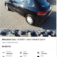 Nyní věnujeme vzpomínku redakčnímu fotografovi Radkovi, který je také otcem ankety Zlatá Vrána. Takového Colta, jakého vidíte na obrázcích výše, koupil svého času taky. Stejný motor i výbava. Dal do něj závodní volant a jezdil s ním plechcup. Koupil ho totiž tuším asi za dvanáct tisíc. Uplynuly čtyři roky a hle – stejný Colt, akorát s podstatně víc zničeným lakem, podívejte se na ty odporné hologramy, se prodává za devadesát. Dobrý pokus, ale na tohle snad nikdo neskočí. A že by auto, které v průměru ročně najelo dva a půl tisíce kilometrů mělo takhle domydlený lak od kartáčové myčky, to se mi skoro nechce věřit. Asi se tu i trochu couvalo…
