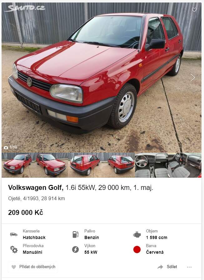 31. 3. 2022, 14:15S těmi zachovalými sockami s málo najeto bych to neviděl tak hrozně, ale jejich cenovky možná trochu předběhly dobu. Minimálně do doby, než přestanou jezdit auta v různém stavu rozkladu.