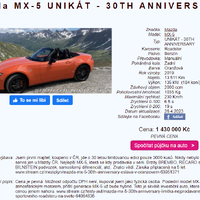 Nepopírám, že “endéčko” ve verzi ke třicátému výročí je veskrze povedené auto. Kombinace oranžové a černé se povedla, je i velice mile naladěná. Ale skoro 1,5 mega za ojetou Miatu je přeci jen trochu moc. V inzerci jsem během asi tří minut našel další 3 kusy oranžové Aniversárky za ceny pod milion. Takže sorry, tohle je prostě vrána jak vyšitá. A věta “skvělé investiční auto, které půjde s cenou jenom nahoru” je v kontextu s cenovkou skoro až legrační.