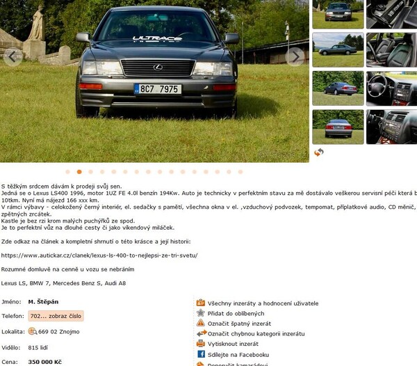 28. 4. 2023, 17:17Za pár let, u Lexusu LS 400, s pouhými 166.000km budete vzpomínat, že byli jen za 350k (není to drahé, k tomu měny/peníze ztratili hodnotu)