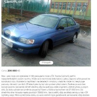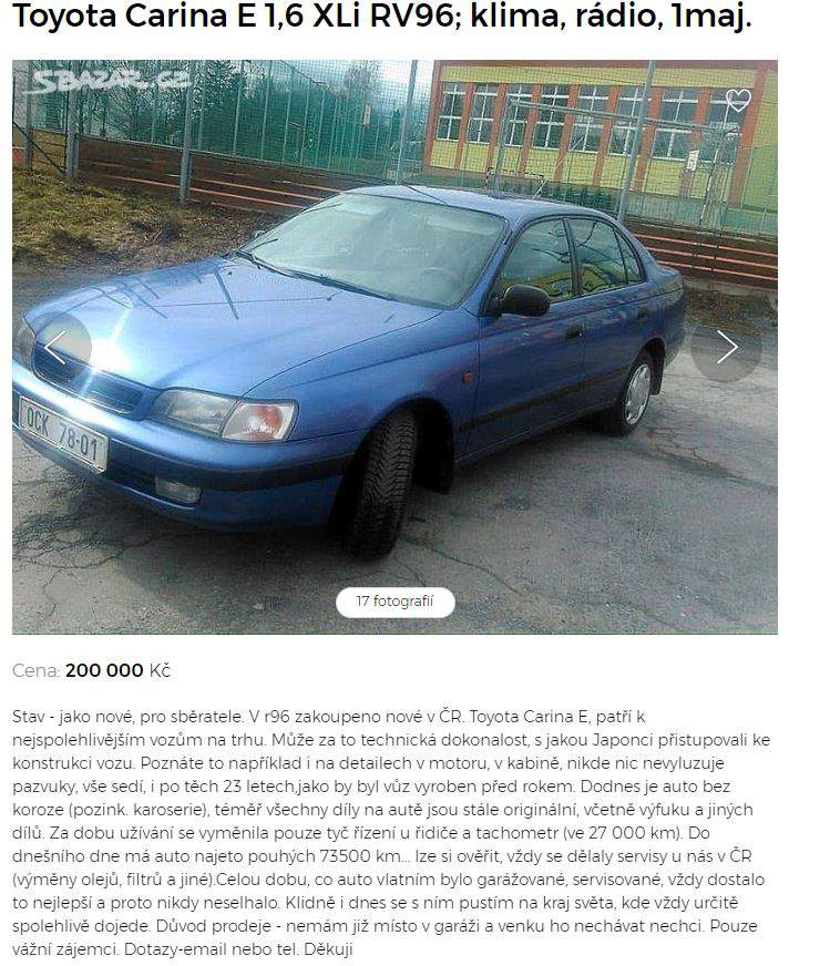 „Stav – jako nové, pro sběratele. V r96 zakoupeno nové v ČR. Toyota Carina E, patří k nejspolehlivějším vozům na trhu. Může za to technická dokonalost, s jakou Japonci přistupovali ke konstrukci vozu. Poznáte to například i na detailech v motoru, v kabině, nikde nic nevyluzuje pazvuky, vše sedí, i po těch 23 letech,jako by byl vůz vyroben před rokem. Dodnes je auto bez koroze (pozink. karoserie), téměř všechny díly na autě jsou stále originální, včetně výfuku a jiných dílů. Za dobu užívání se vyměnila pouze tyč řízení u řidiče a tachometr (ve 27 000 km). Do dnešního dne má auto najeto pouhých 73500 km.…“