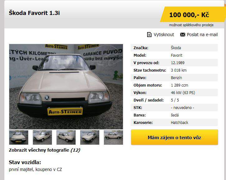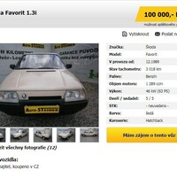 V přiloženém inzerátu se nachází jeden příklad za všechny. Na konkrétního ‚Fakýra‘ si ovšem vyděláte nejdříve tak za rok. Nebudete moct jet ani na dovolenou a vlastně nebudete moct jet nikam, abyste našetřili na krémově bílo hnědého Favorita, který je prostě skvělý. Musí být, jinak by přece nestál sto tisíc. Na druhou stranu má najeto pouze tři tisíce kilometrů. To je desetkrát ze Zlína do Prahy. Nebo tak milionkrát z domova do Kauflandu. Na palubní desce se místo otáčkoměru nachází obrovské hodiny, aby i krátkozraký jedinec vždy věděl, jestli jede za slevami včas. A to je mezi námi důležitější než vědět, jestli motor točí šest tisíc otáček nebo dva. Tím výčet výbavy končí.