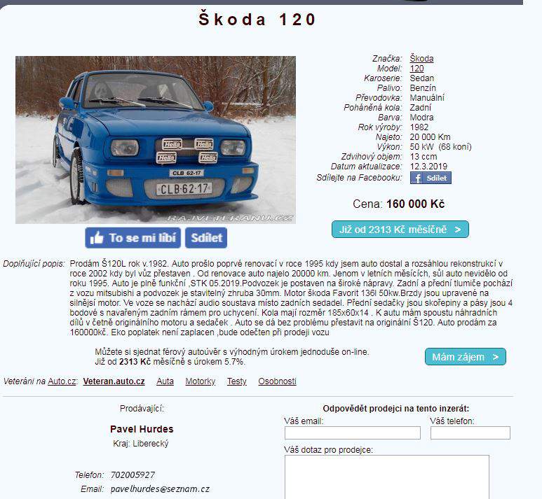 K tématu : najděte si videotest Martina Vaculíka o Škodě 120 z áček / mototechny classic. Hezky střízlivě to okomentoval a musel jsem s ním téměř ve všem souhlasit. Ačkoli mi přijde úchylný dát okolo 100k za perfektně zachovalou škodárnu, už se taková poptávka na trhu vytvořila. A dokonce už jde celkem přesně tržní hodnota určit. Stejně tak u dalších socialistickejch aut. Jenže v inzercích je spousta nabídek úplně mimo ten trh. Viz. 1203 za půl míče... a těm se vysmíváme a jsou to ty zlatý vrány. Navíc Autíčkář píše hodně témat pro pobavení a proto aby pod články vznikaly diskuze jako třeba tahle ...