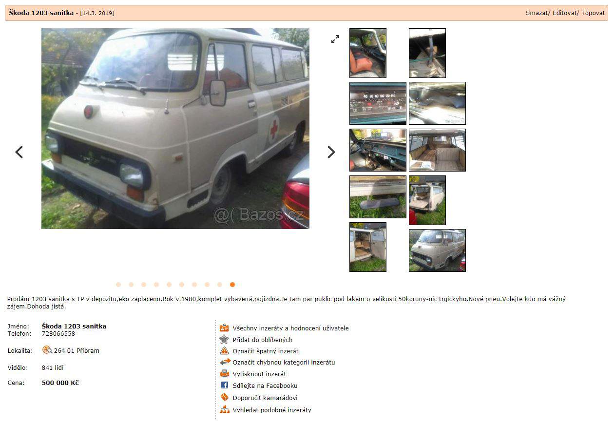Milí čtenáři, myslím si, že tento inzerát vyhraje jednu z největší vran dnešního článku. Cítím ten stejný pocit nicoty jako u každého takového inzerátu. Není mi zcela jasné, co musí člověka donutit k prodeji hromady ničeho za půl milionu korun. Auto má nové pneumatiky a pár puchýřů na laku. To je skvělé, to je určitě důvod, proč stojí tolik. Ne. V tomhle autě bohužel neseděl Jaromír Hanzlík, když jel zachraňovat v seriálu Sanitka oběti leteckého neštěstí na Suchdole. Pravděpodobně se v něm nestalo ani nic jiného, než že vozilo pacienty z bodu A do bodu B. Prostě obyčejná sanitka. Možná by se měla k autu nabízet jako dar i antidepresiva. Po utracení půl milionu za auto bude deprese velmi aktuální problém. Sám sebe se ptám, co je horší. Jestli pustit do světa takový inzerát, nebo si něco takového opravdu pořídit.