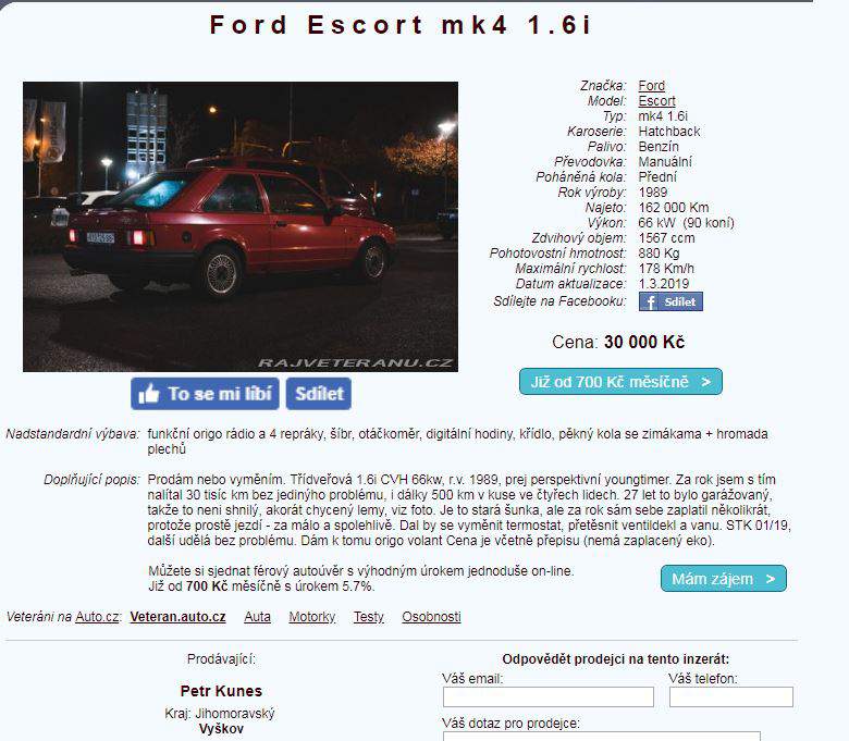 23. 3. 2019, 13:43Když pominu to, že si každej určí cenu prodávané věci svobodně tak. Tak tu máme snahu dělat youngtimer z každý ohnilý mrdky. Kdyby mi někdo poradil, že za půl míče chodí Escort v cábru tak jich navezu tak 100 alespoň.
