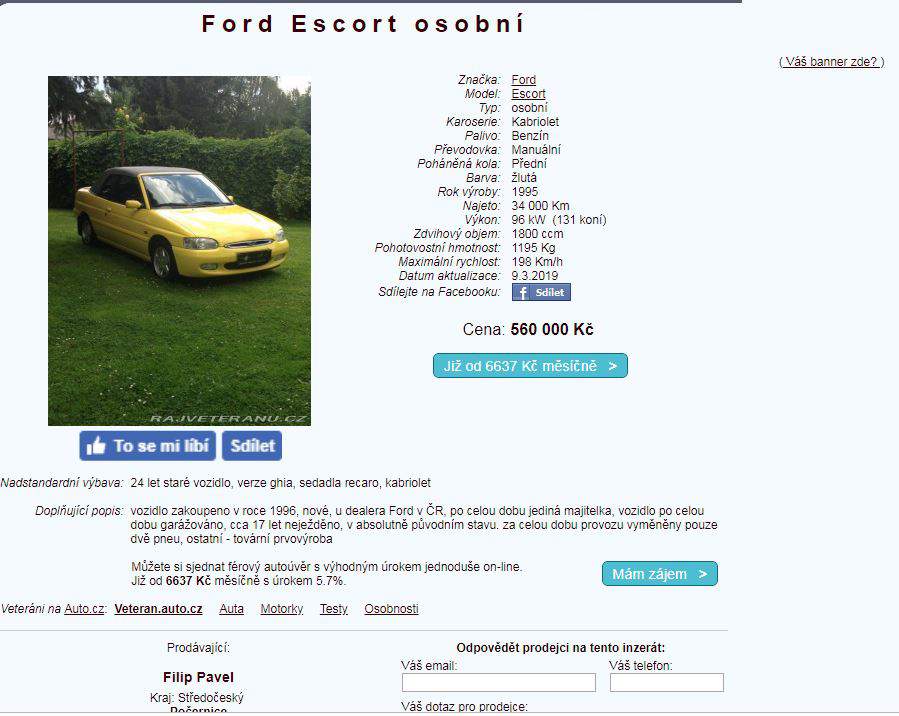No nic, ale ten žlutej Escort už jsem viděl před časem a koukám, že se furt ještě neprodal... Ale u té Cariny je připsané - zamluveno. Buď je to starý marketingový trik anebo nějaký borec vážně zatoužil po kvalitním japonském voze natolik, že za to dal tolik, kolik by mu dokázalo pořídit funglovou Dacii Sandero v metalíze... :)
