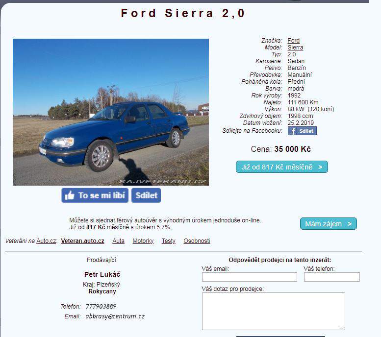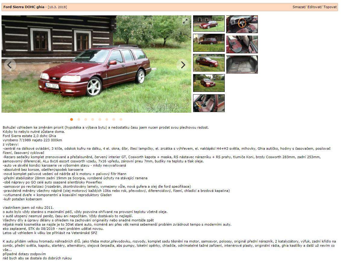 Tento inzerát dokonale zhmotňuje situaci nastíněnou v úvodních řádcích článku. Auto má najeto 223 tisíc kilometrů a rozhodně již bude mít něco za sebou. Ač je obdařeno nejvyšší výbavou Ghia, co to pro nás dnes znamená? Stahování oken v elektrice? Cítím u inzerátu trochu typický problém mnoha bazarových aut s nesmyslnou cenou. Kombinace hlubokého citového pouta a velkého množství peněz utopených v udržování slušného stavu. Pravdou může být, že auto je v super stavu, má mnoho věcí navíc, třeba přečalouněný interiér, jinou kapotu a nárazník, ale i tak. Za 165 tisíc se dá bez problému koupit Subaru Impreza první generace s menším nájezdem a potenciálem si na sebe vydělat. Ale Sierra v kombíku? No. Hodnocení nechám na vás.