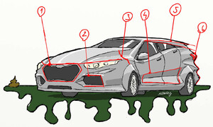 - silně se svažující kapota vypadá jako předokolková, čemuž dopomáhá i linie bočních oken zapíchnutá hluboko pod linii kapoty. Stačí zakulatit zadek a je z toho víeméně typický hatchback...