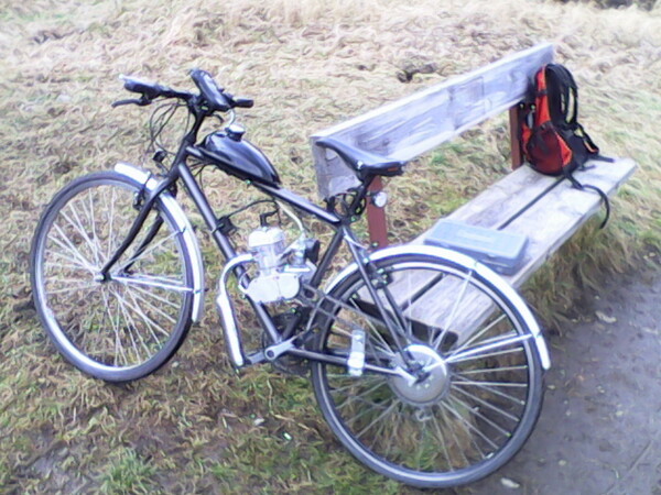 Jako správný petrolhead vlastním kolo, které pohání spalovací motor. Maximální výkon taky cca. 2kW, maximální rychlost kvůli zpřevodování spíš do kopců cca. 50kmh. Spotřeba 1-2L / 100 km.